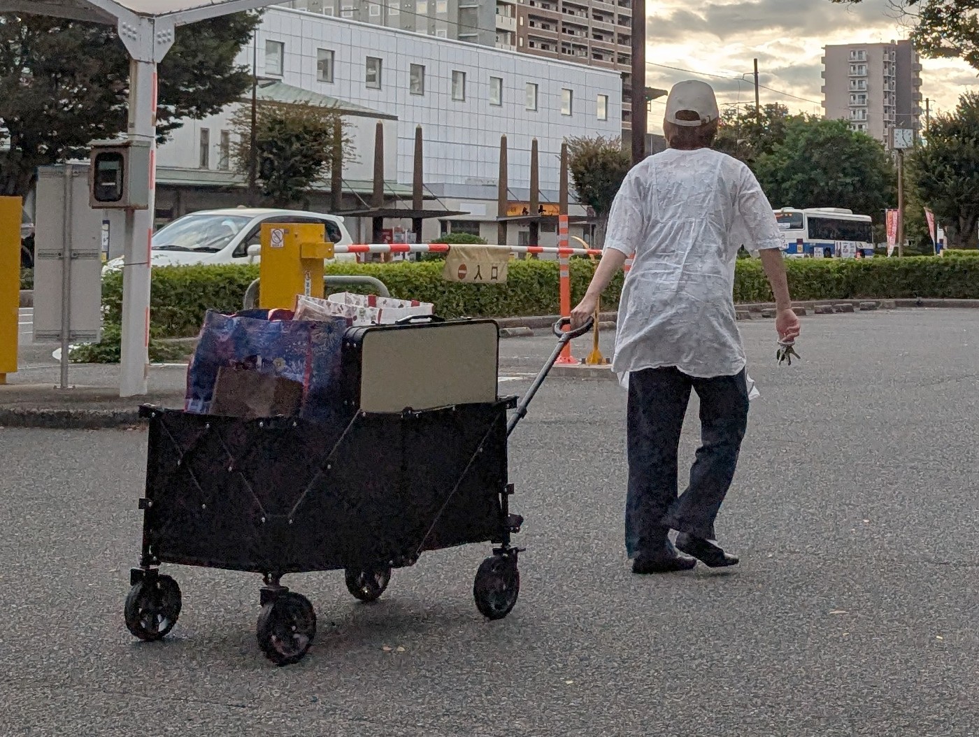 会場は防府駅のすぐ横で、幸い防府駅の構内に駐車場がありましたのでそこに車を止めて時間が来るのを待っていると写真のような車を引っ張っている人を1時間くらいの間に5人見かけました。