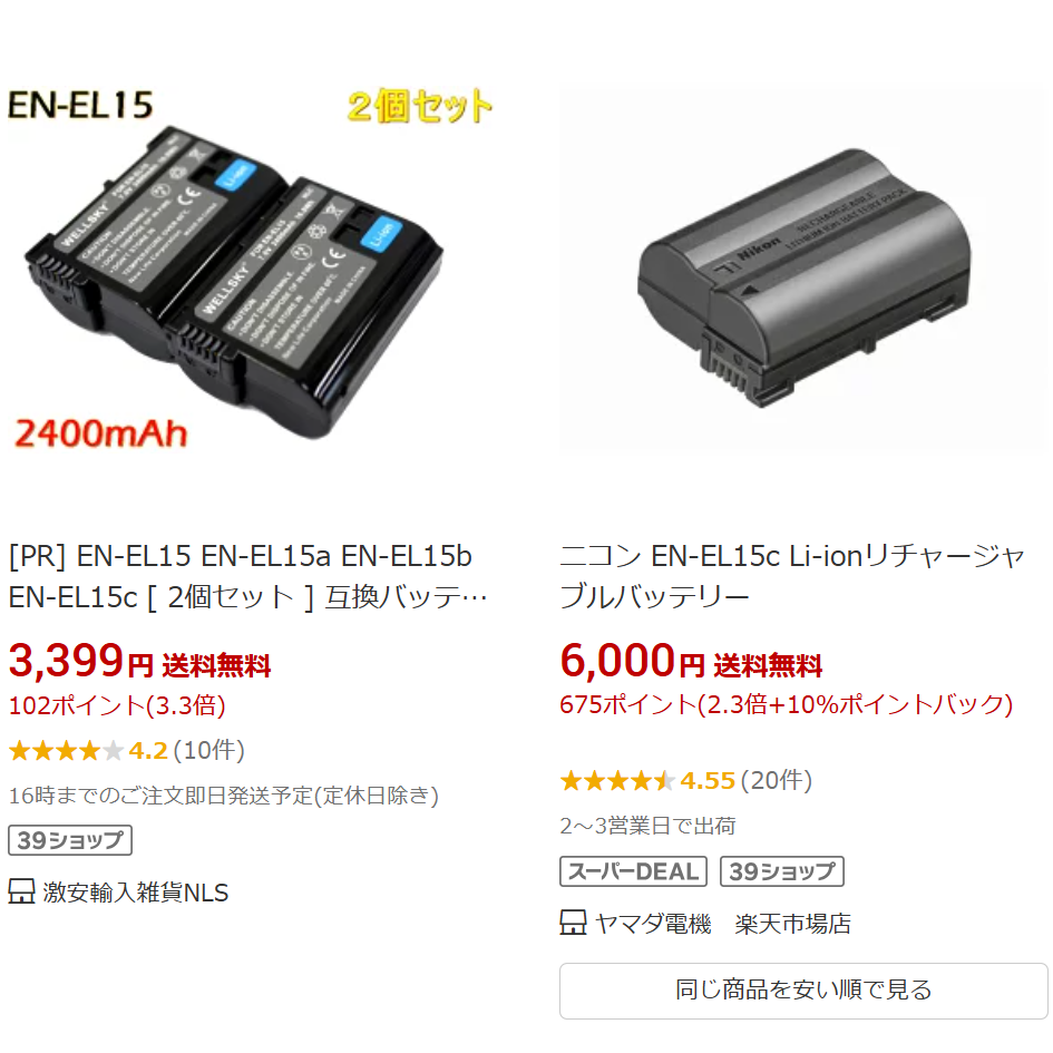 ちなみに楽天では中国製の互換は2個セットで3399円、ニコンの純正品は1個6000円です。相当金額が違います。
