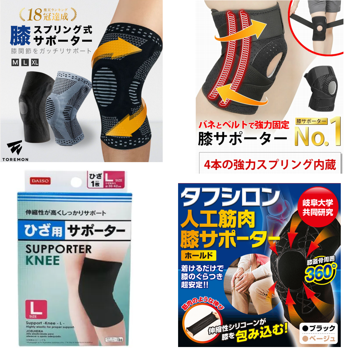 これらがヒザのために買ったものです。ダイソーの「超強力マグネット」が入ってますが、これは磁気ネックレスの原理で磁石を貼っていたら痛みが弱くなるのではないかと思って使ってみたものです。