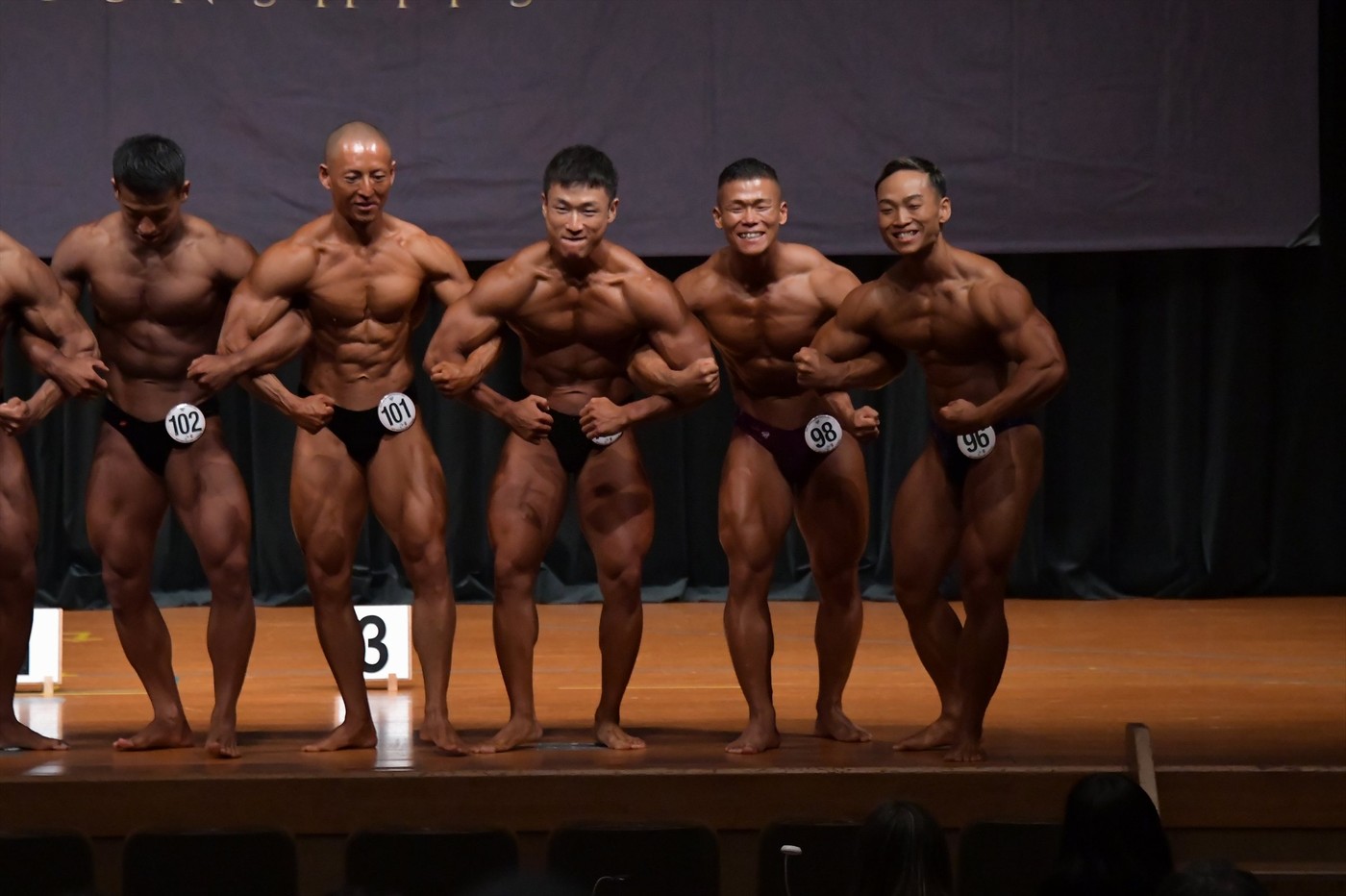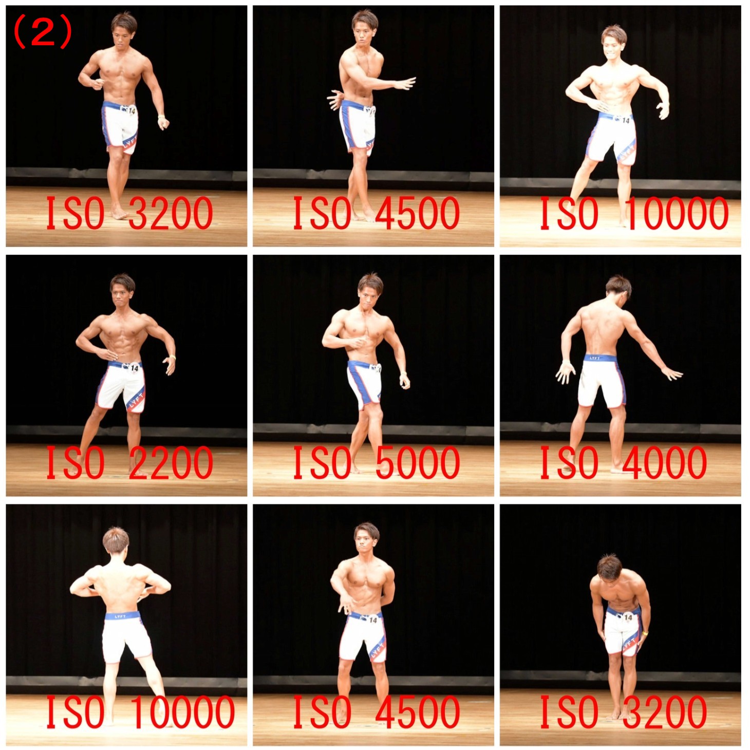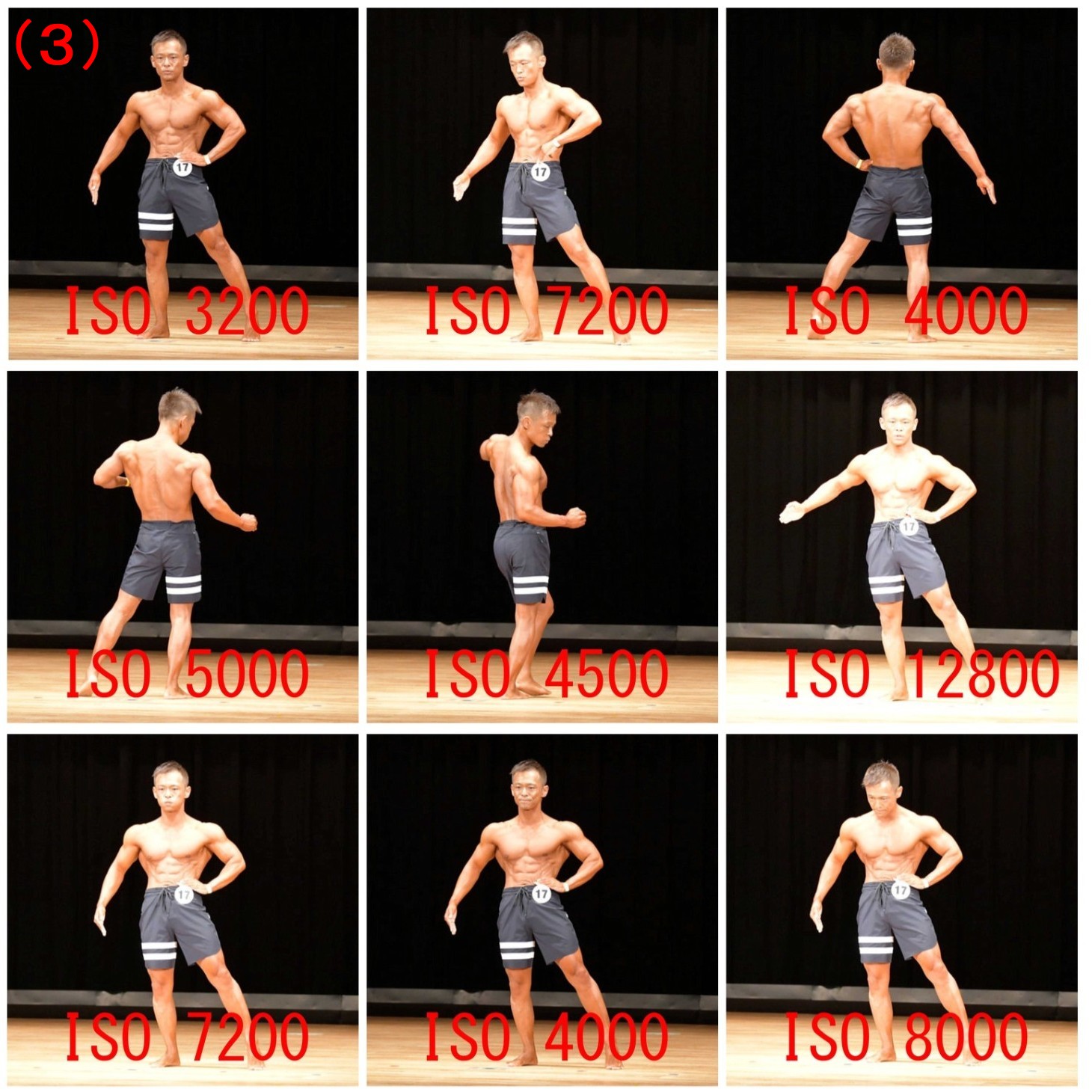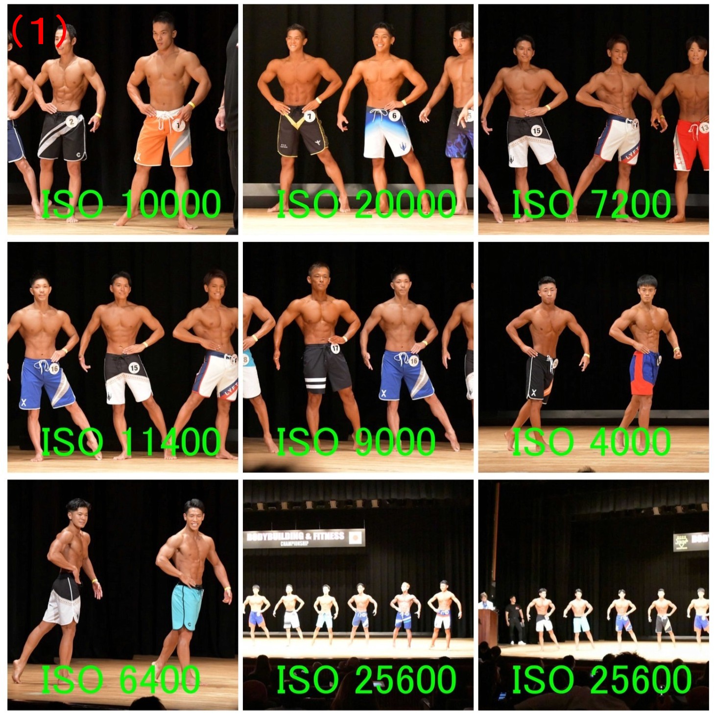 (1)はステージの右から左まで選手が並んでいる状態を右から順に撮ったもので、ステージの端でも中心でもほぼ適切な明るさになっていますが、ズームアウトして最後の2枚の全体を撮った構図になるとISO 25600になってしまって明る過ぎる写真になっています。