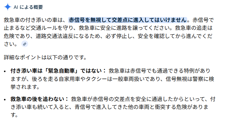 「なるほどそうだったんか。」と思いました。ですが後になってふと思い出し、本当かどうか気になったのでネットで調べてみましたら、赤で通過できるのは救急車だけで、一般車両は付き添いでも赤信号で進入すると違反、と書いてあります。