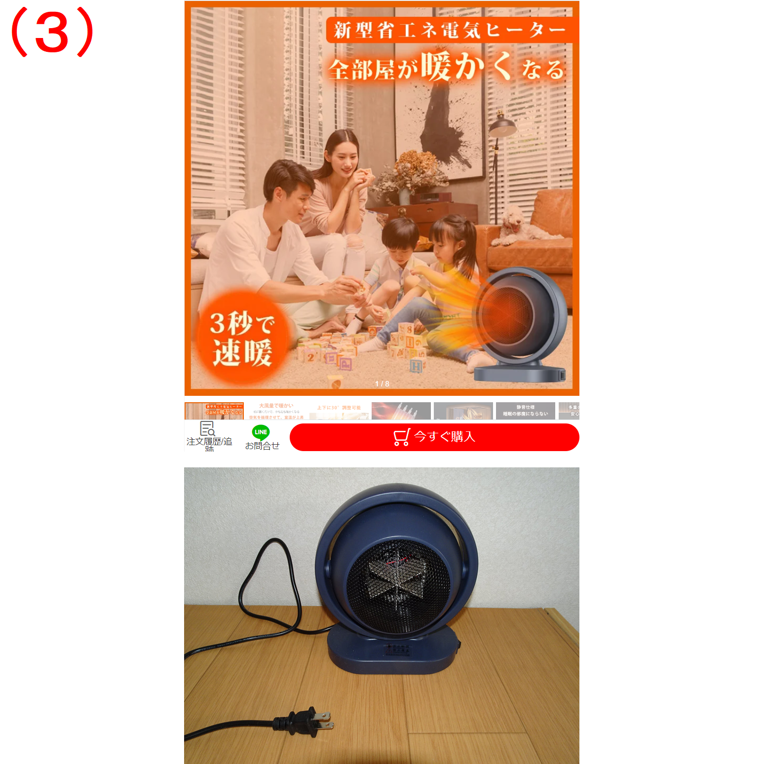 3秒で暖まる小型の超強力暖房器具。高さ20cmくらいの小さいものです。これは2台買いました。ファンヒーターと同じくらいの温風が出るのかと思いましたが、ドライヤーと同じぐらいの温風でした。とても部屋が暖まるようなものではありません。手を乾かすくらいしか使えません。届いたその日に捨てることを決めました。