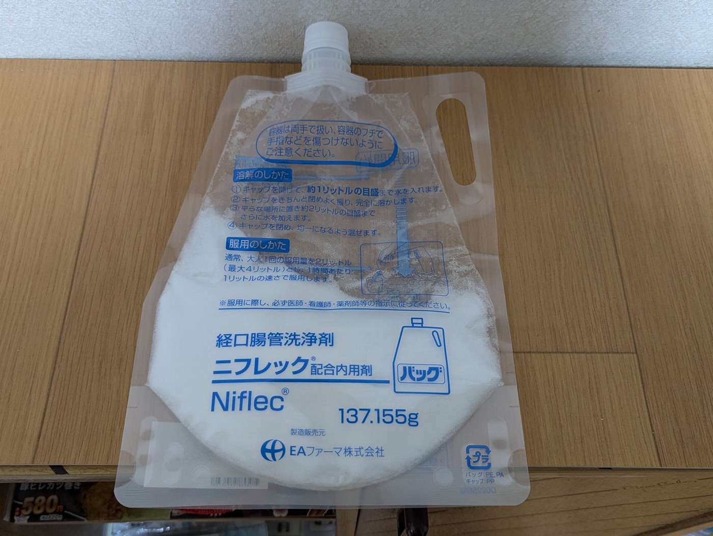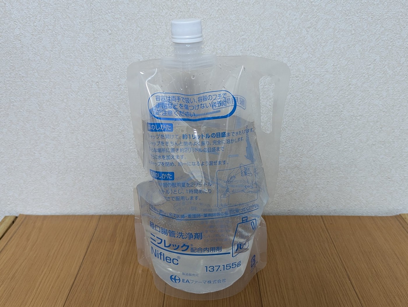 肛門からカメラを入れる前に腸の中をカラにしないといけないということで、これを2リットルの水で溶かして飲むわけですが、飲むと2時間くらいで十数回トイレにいって最後は済んだ水のようなものが肛門から出てくる状態になります。